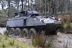 The APC variant of the Mowag has a crew of two and can carry a nine-man infantry section. It has a maximum speed of 100 kilometres per hour, and is fitted with a one-man turret armed with one .50 (12.7mm) Browning HMG, one 7.62mm FN MAG machine gun and eight 66mm smoke grenade launchers.[46] The eighteen Mowag CRVs are fitted with a Kongsberg Remote Weapon Station (RWS) and can be armed with either a 12.7mm/.5 Browning HMG or a Heckler & Koch 40mm automatic grenade launcher. The six MRVs are fitted with a 2-man turret armed with an Oto Melara 30mm cannon and 7.62mm coaxial machine gun.[48]