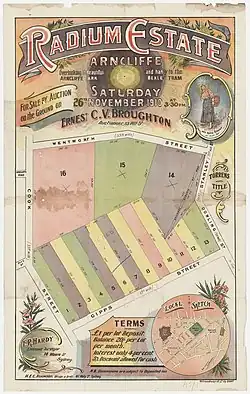 Alderman E.G. Barton worked to develop the district, including the reclamation 120 acres (0.49 km2) of swampland where Barton Park and Kogarah Golf Links now stand. James Beehag also owned land in the area and later became one of Rockdale's early mayors. In November 1910, a series of lots were auctioned by Ernest V. Broughton. The area, bordered by Wentworth, Cook and Dowling streets was called the 'Radium Estate' and had been surveyed by E. R. Hardy.