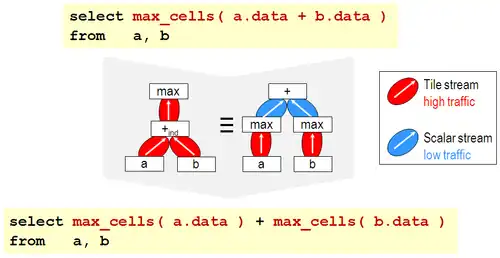 Due to the massive sizes of arrays in scientific/technical applications in combination with often complex queries, optimization plays a central role in making array queries efficient. Both hardware and software parallelization can be applied. An example for heuristic optimization is the rule "maximum value of an array resulting from the cell-wise addition of two input images is equivalent to adding the maximum values of each input array". By replacing the left-hand variant by the right-hand expression, costs shrink from three (costly) array traversals to two array traversals plus one (cheap) scalar operation (see Figure, which uses the SQL/MDA query standard).