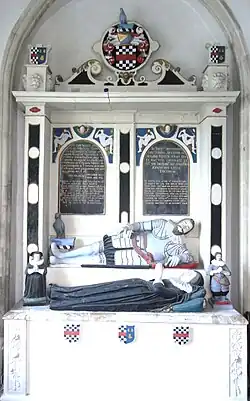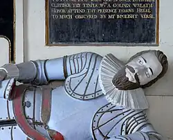 Acland's monument, said to have been erected by his grieving father,[10] survives in Landkey Church. It shows Sir Arthur lying prostrate, in full armour, propped up on his left elbow. In front and below him lies his wife Eleanor Mallet.[7] Above are two round headed black tablets inscribed with gilt lettering.[2]