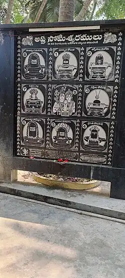The Ashta Someswaras అష్ట సోమేశ్వరములు, Telugu: [aʂʈa soːmeːçʋaɾamulu]) refer to eight Shiva lingas consecrated in the eight directions (cardinal and inter-cardinal) around Draksharamam, a village in Andhra Pradesh, India.