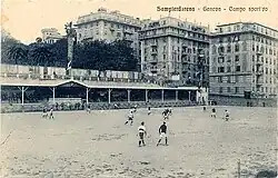 Sampierdarenese took part in the Ligurian round of the 1900 Italian Football Championship, playing one single match against local rival Genoa CFC.[4] Sampierdarenese lost 7 to 0 after playing most of the match with ten players due to the injury occurred to Ferdinando Arnier.[5] This single match was the only appearance of Sampierdarenese before First World War.