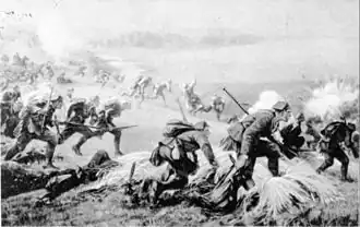 - Battle of the Nek — Two regiments with the Australian 3rd Light Horse Brigade totaling 600 men mounted a bayonet charge on Ottoman defenses situated on a ridge nicknamed the 'Nek', an Afrikaans word for mountain pass, as part of the Battle of Chunuk Bair. Because the terrain created a bottleneck, delays at Chunuk Bair prevented early reinforcements. As the rifles were also unloaded, the attacking Australians lost 372 casualties, or 40 per cent of the force while the Ottomans recorded only eight casualties.[44]