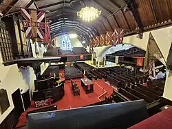 The church contains an unusual double-tier paneled pulpit and rows of wooden pews.[1] There are numerous leaded stained glass windows.[1] There are three first-floor wooden galleries: the trades' gallery, the merchant's gallery, and the sailor's gallery.[1]