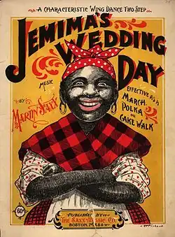 A British image in the Library of Congress, which may have been created as early as 1847, shows a smiling black woman named "Miss Jim-Ima Crow", with a framed image of "James Crow" on the wall behind her.[36] A character named "Aunt Jemima" appeared on the stage in Washington, D.C., as early as 1864.[37] Rutt's inspiration for Aunt Jemima was Billy Kersands' American-style minstrelsy/vaudeville song "Old Aunt Jemima", written in 1875. Rutt reportedly saw a minstrel show featuring the "Old Aunt Jemima" song in the fall of 1889, presented by blackface performers identified by Arthur F. Marquette as "Baker & Farrell".[13] Marquette recounts that the actor playing Aunt Jemima wore an apron and kerchief.[13][35]