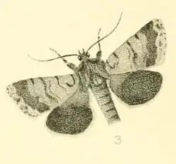 The expansion of the wings is a little over 1 in. The fore wings are dull brownish-ochreous finely speckled with black; there is a conspicuous hook-shaped black mark close to the base, a sharp black mark on the costa at about 1/4, a clouded wavy line near the middle of the wing, darker on the costa, a sharp black mark on the costa just beyond this, followed by a wavy band of dark brownish-black, very much broader on the costa than on the dorsum, and bordered with a pale wavy line towards the termen. The hind wings are dark brownish- black. The cilia of the fore wings are brownish-ochreous, of the hind wings dark - grey. The head and thorax are brownish-ochreous, and the abdomen grey. There are two conspicuous black marks on the anterior portion of the thorax.[4]