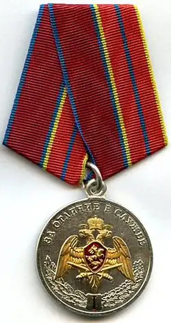 ![]() | Medal "For Distinguished Service" 1st class Mедаль "За отличие в службе" I степени | № 50 - № 233 | 2017-02-14 ---------- 2017-07-24 | Awarded to military personnel serving under contract and military staff members of the troops of the National Guard of the Russian Federation, who positively influenced the service, for conscientious military service and 20 years (years of service) seniority in service or in part-time military service; to persons with prior military service in the Internal Troops of the MVD of Russia, transferred from military service in organs of the MVD to the troops of the National Guard of the Russian Federation after April 5, 2016 who would’ve been awarded the Medal of the Ministry of Interior of Russia "For Distinction in Service", with the required length of military service (seniority) at the time of transfer, who positively influenced the service.[2][6] |