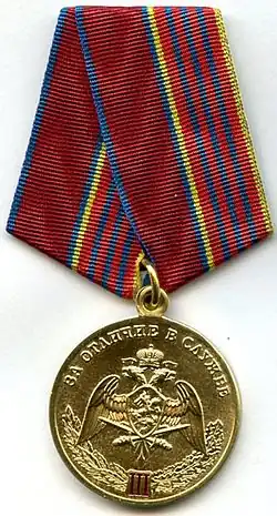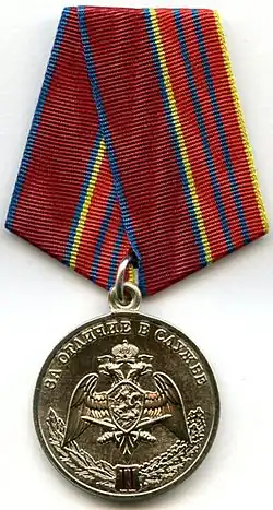 ![]() | Medal "For Distinguished Service" 2nd class Mедаль "За отличие в службе" II степени | № 50 - № 233 | 2017-02-14 ---------- 2017-07-24 | Awarded to military personnel serving under contract and military staff members of the troops of the National Guard of the Russian Federation, who positively influenced the service, for conscientious military service and 15 years (years of service) seniority in service or in part-time military service; to persons with prior military service in the Internal Troops of the MVD of Russia, transferred from military service in organs of the MVD to the troops of the National Guard of the Russian Federation after April 5, 2016 who would’ve been awarded the Medal of the Ministry of Interior of Russia "For Distinction in Service", with the required length of military service (seniority) at the time of transfer, who positively influenced the service.[2][6] |