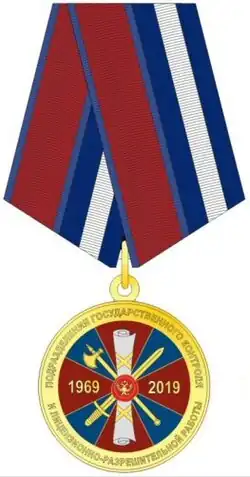 ![]() | Commemorative medal "50 Years of the Establishment of State Permits and Licensing Units" Памятный медаль "50 лет со дня образования подразделений государственного контроля и лицензионно-разрешительной работы" | № 23 | 2019-01-23 | Awarded to military personnel, persons serving in the forces of the National Guard with special police ranks, and civilian personnel (federal state civil servants and employees) of the forces of the National Guard, who have served (worked) impeccably for three years or more in calendar terms, in the licensing and permit units of organs of the Ministry of Internal Affairs of Russia and the National Guard; to citizens discharged from military service to the reserves (retirement), who have made a significant contribution to the performance of tasks and the exercise of the powers assigned to licensing and permit units; to persons assisting in the performance of tasks and the exercise of the powers vested in the licensing and permits units.[9] |