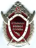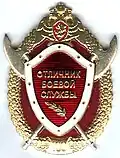 ![]() | Decoration "Excellent in Military Service" 1st class Знак отличия "Отличник боевой службы" I степени | № 111 | 2018-04-02 | Awarded to soldiers, sailors, sergeants and warrant-officers of the National Guard in military service under contract in military units (formations) assigned to protect important state facilities, special cargoes, communications facilities: for exemplary performance of military duties in the absence of any unsatisfactory ratings and with at least 1000 “excellent” marks in military service while part of a guard detail; in military service under contract in special motorized military units (formations) of the troops of the National Guard, for exemplary performance of military duties in the absence of unsatisfactory ratings and at least 1000 "excellent" marks in military service as members of military units tasked with maintaining of public order.[11] |