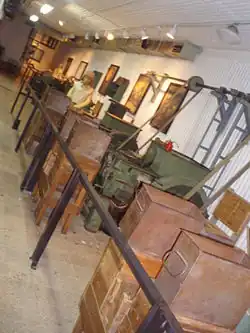 The guided tour shows the laundry room and the secret entrance under the washing machine. The tour enters the factory through an alternate entrance – installed for today's visitors – located in the bakery, going down a spiral ladder 25 feet into the ground. The machines are located in the main room, and still function today thanks to a team of engineers from the Society for the Preservation of Israel Heritage Sites.[11] The electricity necessary to run their transmission belts back in the 40s was secretly branched off the train operating site, as testified by a little "thank you for it" sign attached to the wall next to the machines in the museum. The tour also shows the UV-radiation room, the toilets (their content was pumped to the kibbutz's sewage system) as well as the ammunition packing station. It ends with a walk back through the kibbutz facilities, which are relatively well preserved thanks to the military use of the area after independence.
