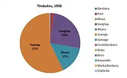 The area was traditionally inhabited by the settled Songhay, and the nomadic Tuareg, Arabs, and Fulas (Fula: Fulɓe; French: Peul).[66] The ethnic composition of the regions in 1950 (at that time, Kidal Region was a part of Gao Region) and in 2009 is shown in the adjacent diagrams.