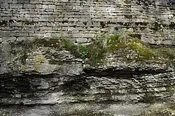 The source is covered by limestone and marl of the Kimmeridgian age, which form a small cuesta visible to the southeast of the village of Bèze, under the compact limestone of the Portland Group. The ceiling of the cave is covered with kaolinite while the walls are covered with manganese oxide in some places.[10] The set of galleries has a slight but steady incline towards the south, where it is covered by patches of Cretaceous rocks and then by the Tertiary sediments of La Bresse.[9] The karst in the region must have been established either at the end of the Oligocene, or during the Miocene.[11]