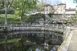 The geographer François Robert wrote in 1789 that the Bèze spring is one of the four most significant in France.[20] The spring is the most photographed place in Bèze. Some postcard publishers do not hesitate to improve the picture by scratching the glass plate negative for a more impressive outpouring.[15] The walk at the source around the spring is a monument historique site with construction dated to the 18th century and trees that are 200 to 300 years old.[21]