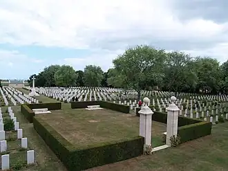 The Bény-sur-Mer Canadian War Cemetery (French: Cimetière militaire canadien de Bény-sur-Mer) is a burial ground containing predominantly Canadian soldiers killed during the early stages of the Battle of Normandy in the Second World War. It is located in, and named after, Bény-sur-Mer, in the Calvados department, near Caen, in lower Normandy. As is typical of war cemeteries in France, the grounds are landscaped and kept. Contained within the cemetery is a cross of sacrifice, a monument typical of memorials designed by the Commonwealth War Graves Commission.