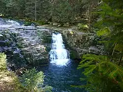 The Bílé Labe is known for its high density of waterfalls and cascades. Their formation was caused by tectonic movements.[4] There are ten waterfalls and cascades on the lower half of the river. The most popular of them is Velký vodopád with a height of 3.8 m (12 ft). Other named waterfalls are Dlouhý vodopád (14.5 m (48 ft) high), Plotnový vodopád (5.3 m (17 ft) high), Velký skok, Balvanový vodopád and Lavinová peřej.[5][6]
