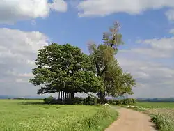 The Babisnau poplar is situated on a Cretaceous (Turonian) Pläner sandstone table, with its top elevation reaching around 320 meters above sea level.[2] This sandstone table is characterized by a slight dip, sloping gently northward towards Golberode, with slopes having inclinations of two to four degrees. At the Zughübel, there is a distinctive west and southwest-facing stratification step that rises approximately 40 meters high, marking the edge of the table where it meets the Zertal area of the Possendorf stream. On the top of the sandstones, there exists a shallow loess-loam cover, upon which shallow cover loess-parabrown soils have formed.[3] These geological conditions at the Zughübel have created an environment where the poplar can thrive. The poplar belongs to a genus that typically grows in moist lowland areas rather than on a ridge, making its presence at this location unique.[4]