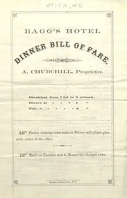 The "Utica Tally-Ho Stage Coach" transited travelers to and from the hotel.[3] There was a fire in the "wineroom" in 1895.[4]