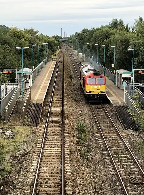 Baglan railway station is a minor station in the village of Baglan in Neath Port Talbot county borough, south Wales. It is 204 miles 53 chains (329.4 km) from the zero point at London Paddington, measured via Stroud.[1] It is a stop on the South Wales Main Line, served by Transport for Wales Swanline regional trains between Swansea and Cardiff.