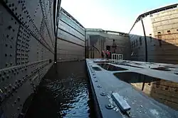 To further restrict saltwater intrusion, in 1966, a hinged barrier was installed just upstream of the large lock. This hollow metal barrier is filled with air to remain in the upright position, blocking the heavier salt water. When necessary to accommodate deep-draft vessels, the barrier is flooded and sinks to the bottom of the chamber.[2]: 3