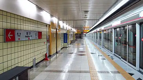Bangchon Station is a station of the Daegu Subway Line 1 in Bangchon-dong, Dong District, Daegu, South Korea. It has train service until midnight.[1]