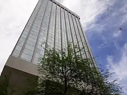 The Bank of America Plaza (formally Arizona Bank Plaza) is a high-rise office building which was built in 1977 and is located in downtown Tucson, Arizona. It was designed by Friedman & Jobusch and built by DEFCO Construction Company.[4] It took over the top spot from the Pima County Legal Services Building, which was the tallest building from 1967 to 1977. It was the tallest building in Tucson from the time of its completion in 1977, until 1986, when the UniSource Energy Tower was completed.[5] It is located at 33 North Stone Avenue, at the southwest corner of Stone Avenue and Pennington Street.[6] The Bank of America Plaza is one of three major skyscrapers in the downtown Tucson area that compose the highest part of the city's skyline, the other two being the One South Church (formerly UniSource Energy Tower) and the Pima County Legal Services Building.