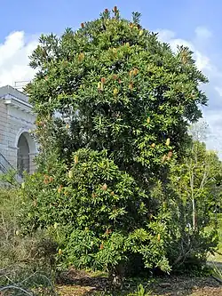 Banksia serrata, commonly known as the saw banksia,[2] the old man banksia,[3] the saw-tooth banksia or the red honeysuckle and as wiriyagan by the Cadigal people, is a species of woody shrub or tree of the genus Banksia, in the family Proteaceae. Native to the east coast of Australia, it is found from Queensland to Victoria with outlying populations on Tasmania and Flinders Island. Commonly growing as a gnarled tree up to 16 m (50 ft) in height, it can be much smaller in more exposed areas. This Banksia species has wrinkled grey bark, shiny dark green serrated leaves and large yellow or greyish-yellow flower spikes appearing over summer. The flower spikes, or inflorescences, turn grey as they age and pollinated flowers develop into large, grey, woody seed pods called follicles.