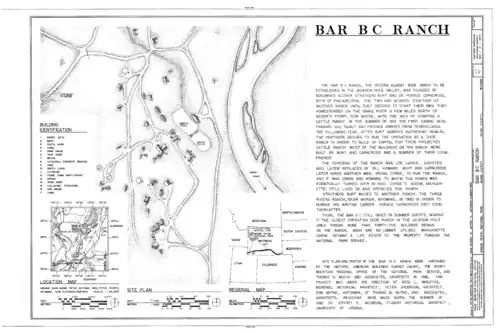 The Bar B C Dude Ranch was established near Moose, Wyoming in 1912 as a dude ranch by Struthers Burt and Dr. Horace Carncross, using their initials as the brand. Rather than converting a working ranch, Burt and Carncross built a tourist-oriented dude ranch from the ground up, using a style called "Dude Ranch Vernacular", which featured log construction and rustic detailing. As one of the first dude ranches in Jackson Hole, the Bar B C was a strong influence on other dude ranches in the area, and employed a number of people who went on to establish their own operations.[2] It was acquired by the National Park Service and incorporated into Grand Teton National Park upon the expiration of a life estate. The ranch was listed on the National Register of Historic Places in 1990.