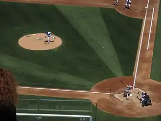 With a runner on base and taking a lead, the pitcher may attempt a pickoff, a quick throw to a fielder covering the base to keep the runner's lead in check or, optimally, effect a tag out.[36] Pickoff attempts, however, are subject to rules that severely restrict the pitcher's movements before and during the pickoff attempt. Violation of any one of these rules could result in the umpire calling a balk against the pitcher, which permits any runners on base to advance one base with impunity.[37] If an attempted stolen base is anticipated, the catcher may call for a pitchout, a ball thrown deliberately off the plate, allowing the catcher to catch it while standing and throw quickly to a base.[38] Facing a batter with a strong tendency to hit to one side of the field, the fielding team may employ a shift, with most or all of the fielders moving to the left or right of their usual positions. With a runner on third base, the infielders may play in, moving closer to home plate to improve the odds of throwing out the runner on a ground ball, though a sharply hit grounder is more likely to carry through a drawn-in infield.[39]