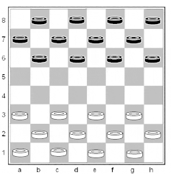 - Starting position. Each player starts with 12 pieces on the dark squares of the three rows closest to their own side. The row closest to each player is called the "crownhead" or "kings row". Usually, the colors of the pieces are black and white, but it is possible to use other colors (one dark and other light). The player with white pieces (lighter color) moves first.