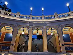 Under the Polish People's Republic, the hill once again became a popular spot for major events, parties and dancing despite the progressive neglect.[11] On 10 May 1967, during juwenalia for students, a part of the colonnade steps collapsed, killing one and seriously injuring several others.[11][14] It was left unattended for years; in 1970 it was listed in the Registry of Cultural Property[15] and renovated between 1973 and 1974, though falling into disuse soon-after.[11] With the fall of communism in 1989, the monument became private property under a 40-year lease contract.[16] It then housed the "Reduta" nightclub, a casino, and various restaurants.[16] Petty crime in the area was commonplace.[11] Due to the severe neglect caused by the owner in subsequent years, the city's government ended the lease terms earlier and expropriated the site in 2017.[11][16] Between 2022 and 2024, a major restoration took place and Bastion Sakwowy regained much of its 19th-century appearance and splendour.[17]