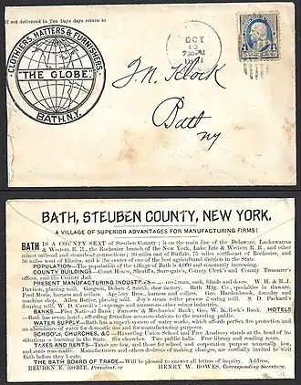 The town was founded in 1793 and was part of a land investment by wealthy Briton William Pulteney, and named after Bath, Somerset in England, where he owned extensive estates. It was created along with Steuben County in 1796 and became a mother town of the county, eventually yielding land to seven later towns. The Lackawanna Railroad opened its mainline through Bath, and opened a station, in 1882.[3]