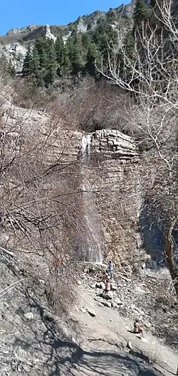 Battle Creek and its waterfall are located in a semi-arid to desert climate in one of the main canyons of the Timpanogos massif.[5] The creek flows from a natural spring located upstream of the waterfall. While flow is largest during the snow melt of the spring season, both the creek and the waterfall are perennial.[6]