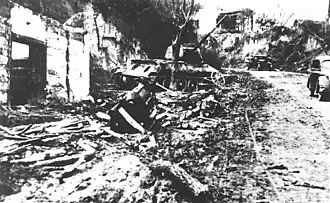 ![]() Photograph of destroyed buildings in Batina after the battle captured by the 1st Vojvodinian Brigade on 30 November 1944. | |||||||