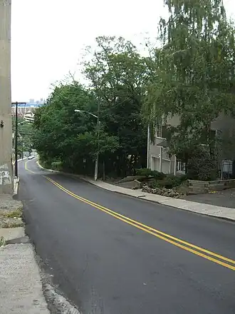 ![]() Bulls Ferry Road descends from the top of the Hudson Palisades down to the river. | |||||||