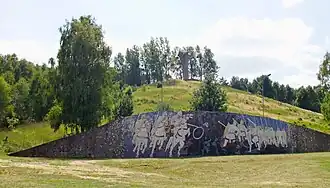 Several battle memorials were installed in the small town: walls were covered with mosaics depicting medieval battle scenarios, wooden statues of knights were placed in the town, the hotel was named "Piast" after the dynasty founded by Mieszko I.[6] A hill near the town was converted into the battle memorial "Victory at Cedynia", with a 15 metres (49 ft) tall concrete statue on the hilltop, showing a Polish eagle sitting on a sword rammed in the hill, the face turned west overseeing town and Oder river.[8] The mosaics on the hill's foot show white knights encircling and defeating black knights.[7] The monument was erected in 1972 to commemorate the 1000th anniversary of the battle, which was celebrated in the town by people from all regions of Poland, including high-ranking politicians, and accompanied by a large youth festival, "Cedynia 72".[5]