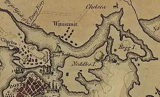 The Battle of Chelsea Creek was the second military engagement of the Boston campaign of the American Revolutionary War. It is also known as the Battle of Noddle's Island, Battle of Hog Island and the Battle of the Chelsea Estuary. This battle was fought on May 27 and 28, 1775, on Chelsea Creek and on salt marshes, mudflats, and islands of Boston Harbor, northeast of the Boston peninsula.[6] Most of these areas have since been united with the mainland by land reclamation and are now part of East Boston, Chelsea, Winthrop, and Revere.