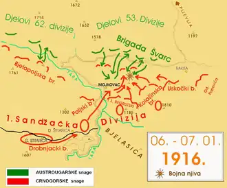 The Montenegrin forces continued to hold the Berane-Andrijevica-Mojkovac-Tara River line until withdrawing on 18 January.[7] The Austrians then continued pushing their offensive south.