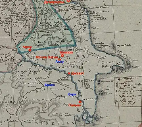 The battle for Shamakhi began on 9 November 1578 and lasted for several days.[9][12] On the morning of the third day, the brother of the Crimean Khan, Adil Giray, at the head of 15 thousand Tatar horsemen, came to the aid of the Ottomans, this decided the outcome of the battle and the Safavids were defeated.[3][13][14] Aras Khan and his son were taken prisoners by the mirakhur Adil Giray and were executed.[6][11][15] The losses on both sides were enormous.[10][16]