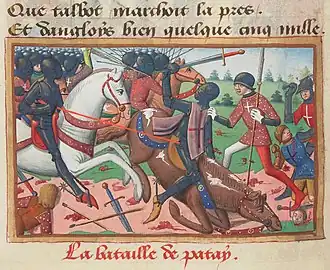 The Battle of Patay, fought on 18 June 1429 during the Hundred Years' War, was the culmination of the Loire Campaign between the French and English in north-central France. In this engagement, the horsemen of the French vanguard inflicted heavy casualties on an English army; most of them sustained by the longbowmen as the English cavalry fled. In addition, all but one of the senior English commanders were captured. A victory often credited to Joan of Arc, she was in fact not present for the battle as she had remained with the main body of the French army. The vanguard at Patay was led by La Hire and Jean Poton de Xaintrailles.