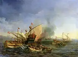 In 1320—although some sources put it in 1321 or 1322—Rhodes itself was targeted by the Turks of Menteshe, under Orhan Bey.[4] A large army was gathered for the purpose, with a fleet of some 80 ships to carry and protect it to the island.[5] Orhan clearly planned to occupy and settle Rhodes, as he took with him many non-combatants, old men, women and children; before attacking Rhodes, he left them at the small island of Episkopi (Tilos).[6] The Hospitallers urgently gathered what forces he could find, mustering four galleys and twenty smaller vessels, to which were joined six Genoese galleys that happened to be at Rhodes.[7] The Hospitaller–Genoese fleet managed to destroy the Turkish invasion fleet, and then sailed to Episkopi, where the Christians slaughtered or enslaved the Turks left there, reportedly 5,000 or even 10,000 people.[7][8]