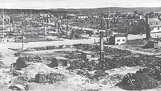 Retreating German forces utilized scorched earth tactics, and though initially German General Lothar Rendulic ordered only the public buildings in Rovaniemi to be destroyed, on 13 October 1944 the German army received orders to destroy all the buildings in Rovaniemi, only excluding hospitals and houses where inhabitants were present. While the German rear guard was going about the destruction, an ammunition train in Rovaniemi station exploded and set fire to the wooden houses of the town. The German troops suffered many casualties, mainly from glass splinters.[3] A Finnish commando unit claimed to have blown up the ammunition train and may well have been the primary cause of the town's ruin. The cause was then unknown and generally assumed to be the deliberate intent of Rendulic. During these hostilities 90% of all the buildings in Rovaniemi were destroyed.