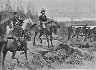 Wachtmeister, alarmed by the gunfire coming from Krutbrånet, sent reinforcements which allowed battalions without ammo to march back to Sävar to resupply.[39][53][54] From his centre, Kamensky observed the Swedish movements and ordered his left wing to sweep around the Swedish right, in an attempt to separate them from the main body.[55] As a result, the Swedish right wing drifted further apart from the centre towards the lake and beyond, where the fighting resumed in a confusing state with shifting luck.[56] The two lines would eventually reach a length of about 2 km (1 mi).[52] Kamensky then launched an attack on the exposed Swedish centre but was checked as Swedish reinforcements came over the stream.[55][note 4] Swedish counterattacks—mainly done by a Jönköping battalion supported by a gun—along the main road towards the Russian artillery in the centre, managed to win ground and temporarily push the Russians back.[57] Wachtmeister failed to organize a concentrated attack to exploit the advance, as his battalions arrived successively while also fighting uphill at a disadvantage of two against three.[58][59][60] Deprived from the essential support, the Swedish attacks stranded against the last Russian centre-reserve, but two Russian major generals had already been wounded, one of them mortally.[46][61]
