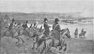 Angered by the prolonged negotiations, Alexander I ordered a continued offensive in northern Sweden; in May, a small Swedish force was quickly overwhelmed at the Battle of Skellefteå—after an heroic defence which saved the vital provisions—leading to the Russian capture of Umeå.[14][15] Västerbotten, all the way from the Kemi and Öre Rivers, was thus occupied by the Russians who, after being denied the Swedish magazines, suffered greatly from the lack of provisions.[16] These could not be brought overseas, since the Swedes had naval supremacy over the Bothnian Bay.[17] After a Swedish counterattack at the Battle of Hörnefors by Johan August Sandels, in July, the fighting once again died out in favor of the prolonged, but ongoing, peace negotiations.[18][19] Many Russian deserters seized the opportunity to surrender themselves to the closest Swedish forces.[20] The same month, Nikolay Kamensky replaced Pavel Andreyevich Shuvalov as the overall commander of the Russian army; he made plans to force the crossing at the Öre River (behind which Sandels' army was positioned) and march into Ångermanland the following month, to collect provisions.[21][22][note 1]
