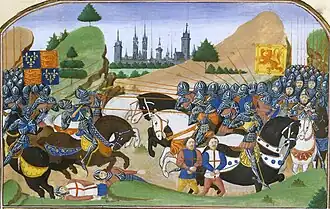 ![]() Battle of Sark, miniature from Bibliotheque Nationale de France, MS Fr. 2691, a copy of a chronicle of Jean Chartier, c. 1470s, probably painted by Philippe de Mazerolles. | |||||||