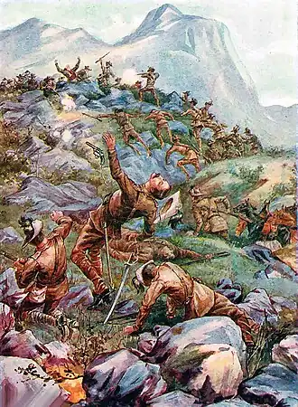 As dawn broke, the British at last came in sight of the Kissieberg. A small Boer picket with one 75mm Krupp gun under Sergeant Hendrik Muller of the Free State Artillery Corps, opened fire. Although Gatacre's force had merely to march around the hill to force the Boers to retreat, about half the infantry rushed forward without orders to storm it. They found that the hill was a typical kopje, ringed by a vertical rock face, which most of them were unable to climb. A few soldiers scrambled to the top, only to be swept off by the British guns which came into action with the rising sun in the gunners' eyes.[4]