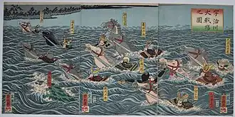 ![]() ![]() Top: Kajiwara Kagesue, Sasaki Takatsuna, and Hatakeyama Shigetada racing to cross the Uji River before the second battle of Uji, New Year's Day, A.D. 1184, as depicted in a print by Utagawa Kuniyoshi. Bottom: A triptych showing the second battle of Uji River on February 19th, 1184, by Isshinsai Yoshikata. Published by Iseya Tokichi, 1863 | |||||||