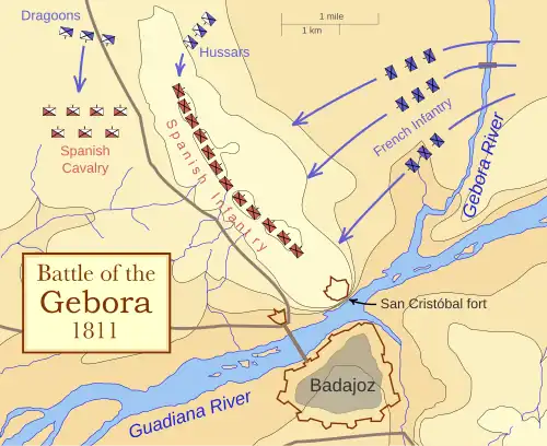 By the afternoon of 18 February, the rains had abated and lower water levels made the Gebora River fordable again.[25] That evening Soult sent nine infantry battalions, three cavalry squadrons and two artillery batteries, under Mortier's command, to the north bank across a flying bridge over the Guadiana River. Joined by six cavalry regiments under Latour-Maubourg, the French now had 4,500 infantrymen, 2,500 cavalry and 12 cannon ready to attack the Spanish lines at dawn on 19 February.[26] Due to heavy fog that morning, Mendizábal was unaware of the approaching French until his picket, only a mile from his front, was driven back by Mortier's infantry fording the Gebora.[27] At the same time the 2nd Hussars, sent by Latour-Maubourg to turn the Spanish left flank, had managed to climb the heights to the north, also undetected, and fell upon one of de España's unsuspecting regiments.[28]