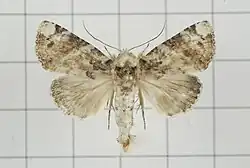 Sexes show strong sexual dimorphism. The male has uniform mottled-brown forewings. There is a pale fawn colored circular apical patch triangular basal patch on the forewings of the male. These patches are whitish in the female. The caterpillar is a semi looper. Early instars are dark green and the second instar has some smoky appearance. Late instars are greenish to pinkish brown. Dorsally, abdominal segments show gray and white marbling. The caterpillar lacks the first pair of prolegs. Pupation occurs in a spindle-shaped leaf cell. Pupa lacks a cremaster.[5]