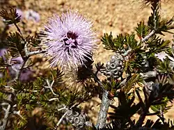 The flowers are bright pink to mauve and are arranged in almost spherical heads on the ends of branches which continue to grow after flowering. The flowers have 5 sepals, 5 petals and 5 bundles of stamens. There are usually 5 stamens in a bundle and they are joined for about half their length. Flowering occurs from September to December and is followed by fruits which are woody capsules.[2][3][4][5]